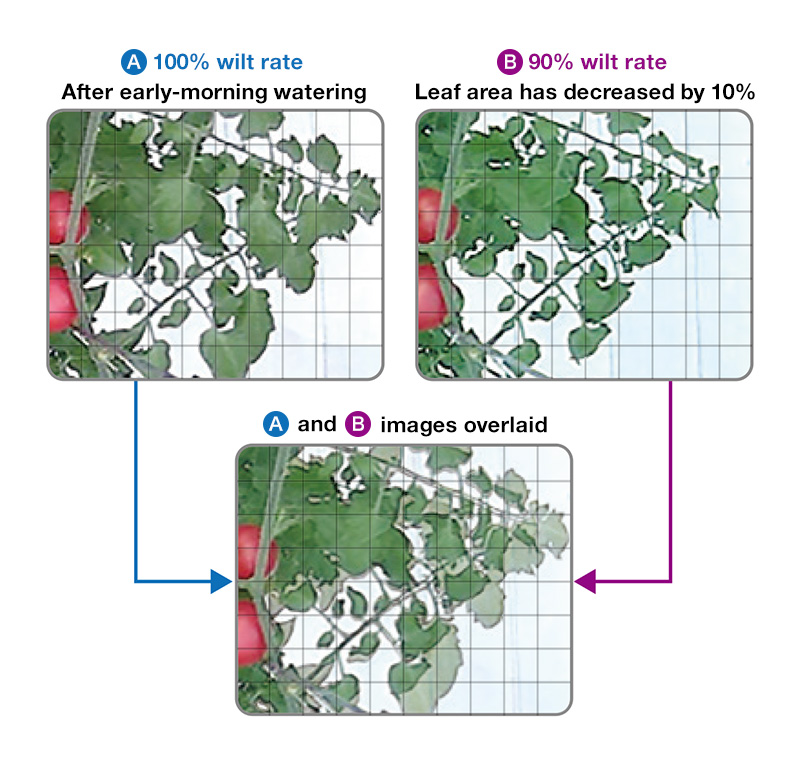 How can the expert intuition and experience used to judge leaf wilting based on color, shape, and softness and determine the optimum watering be quantified? Kubota installed a fixed-point camera to monitor tomato colonies. Realizing that healthy foliage visible in the images decreases when plants wilt, it quantified the coverage rate of plants in the image and used this to calculate the wilt rate. It then considered a mechanism that would automatically water plants when this wilt rate falls below a certain value.