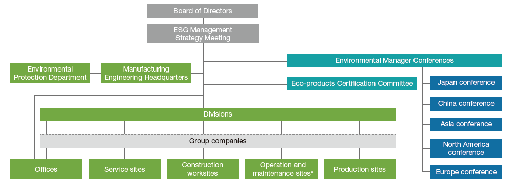 In 2014, the Environmental Management Strategy Committee was established to take a more strategic and innovative approach to environmental management by management-led promotion. In 2021, the ESG Management Strategy Meeting was launched to strengthen management strategies from an ESG perspective, including environmental considerations. In addition, Environmental Manager Conferences are held for each region—Japan, China, Asia, North America and Europe—to globally advance environmental management across the Kubota Group.