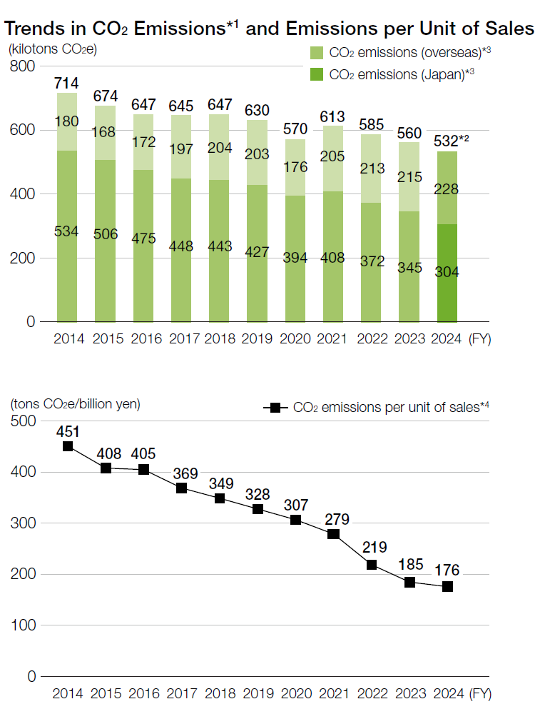 - Improve CO2 emissions per unit of production by 45% compared to the base year FY2014 at the global production sites.