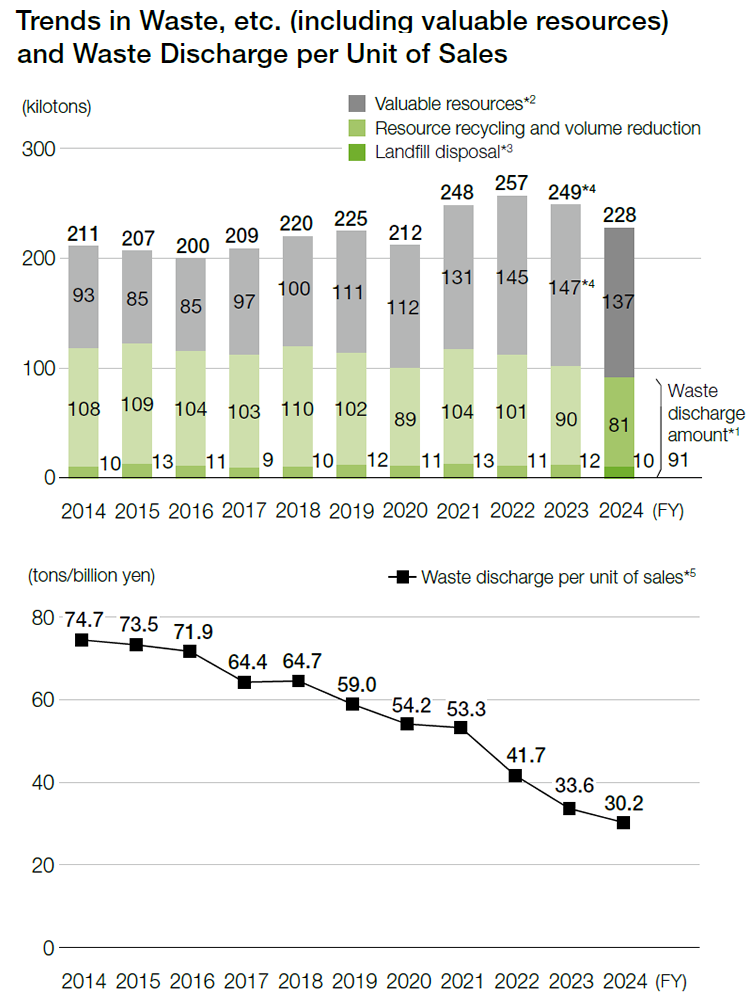 - Improve waste discharge per unit of production by 45% compared to the base year FY2014 at the global production sites.
