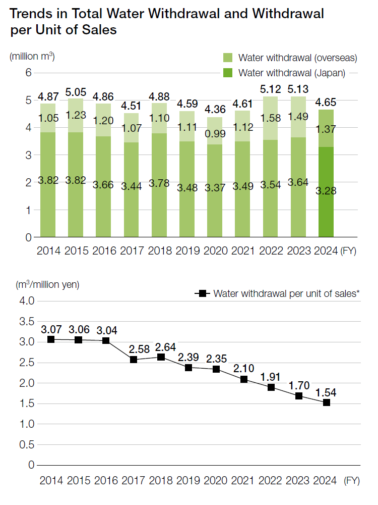 - Improve water withdrawal per unit of production by 35% compared to the base year FY2014 in the global production sites.