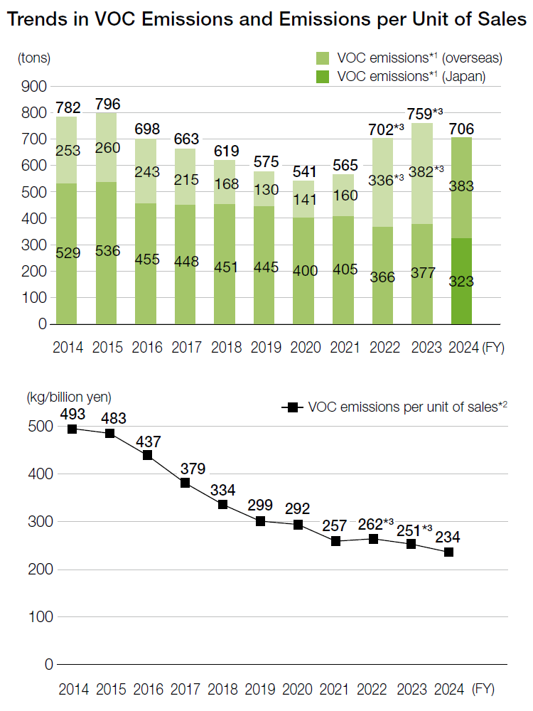 - Improve VOC emissions per unit of production by 42% compared to the base year FY2014 at the global production sites.