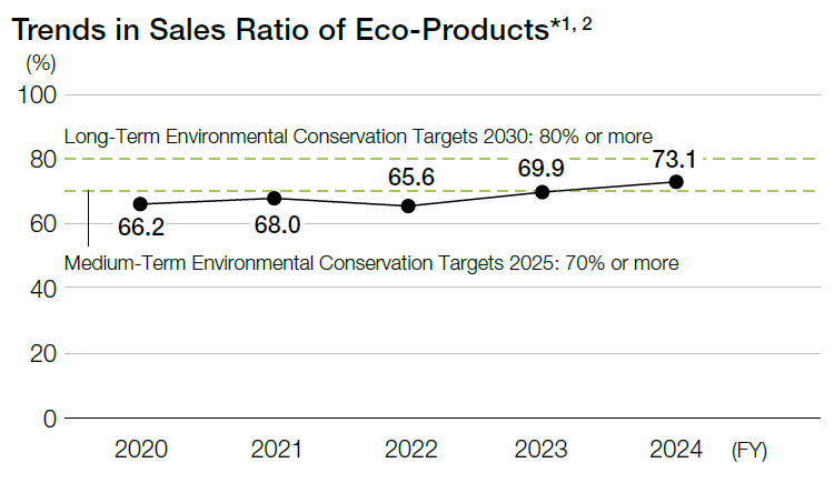 - Increase the sales ratio of Eco-Products-certified products to 70% or more by 2025.