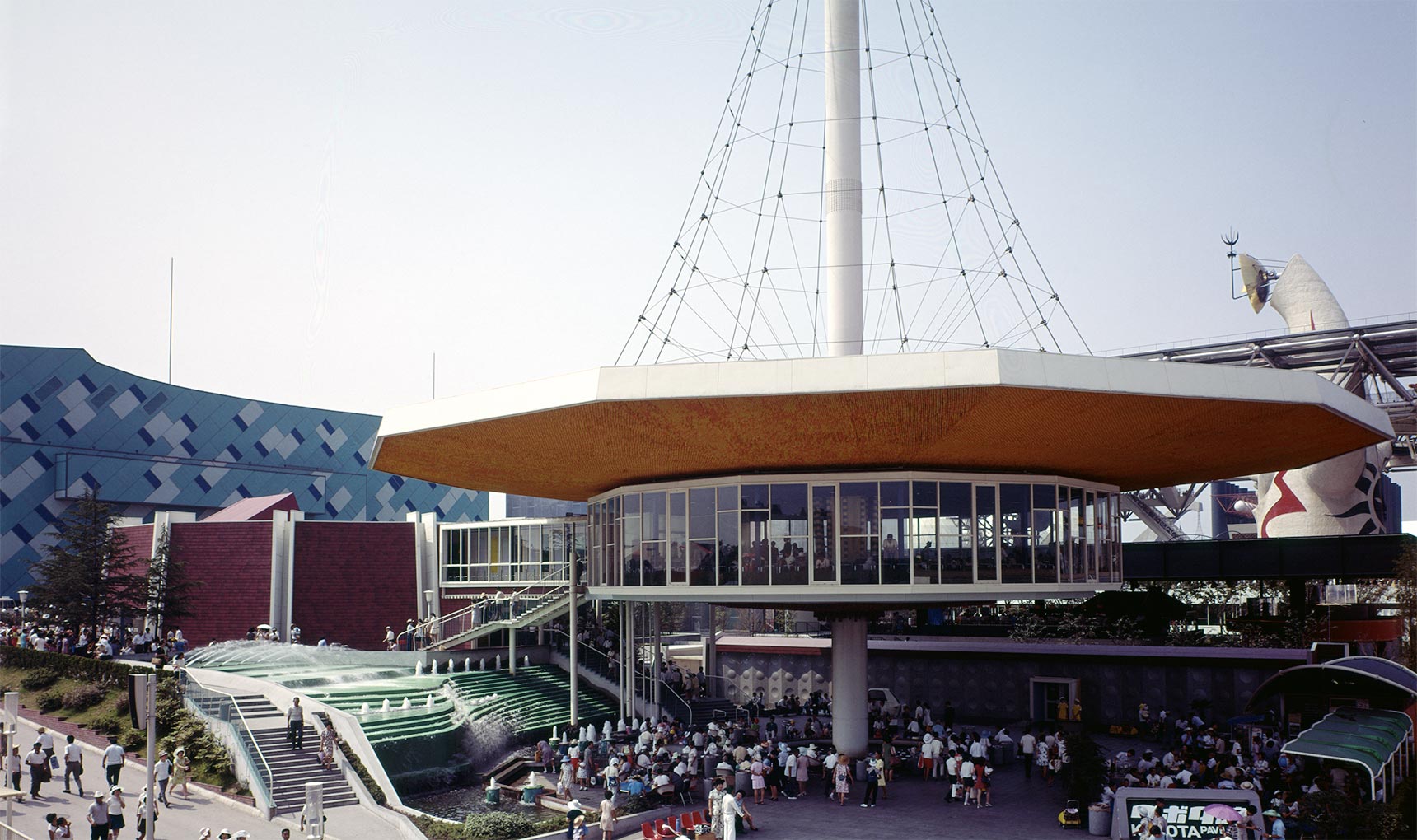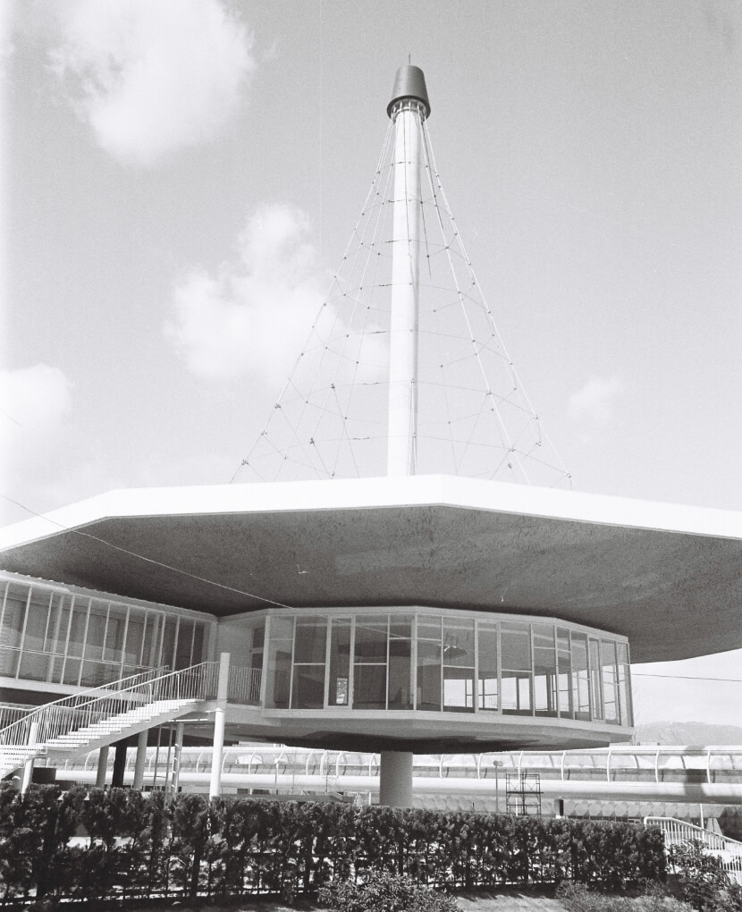 The Symbol Tower was a monopole structure utilizing a G Column (a seamless steel pipe formed into a tubular shape through centrifugal force). The expansive roof and glass-enclosed Sky Room, suspended from the single pillar with wire ropes, were used by visitors as places to relax as well as shelters from the rain and sun.
