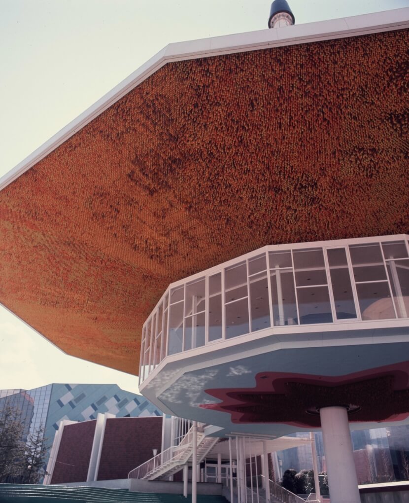 The Kubota Pavilion consisted of three buildings: the Symbol Tower, the Exhibition Building, and the Administration Building, as well as a garden with a waterfall.