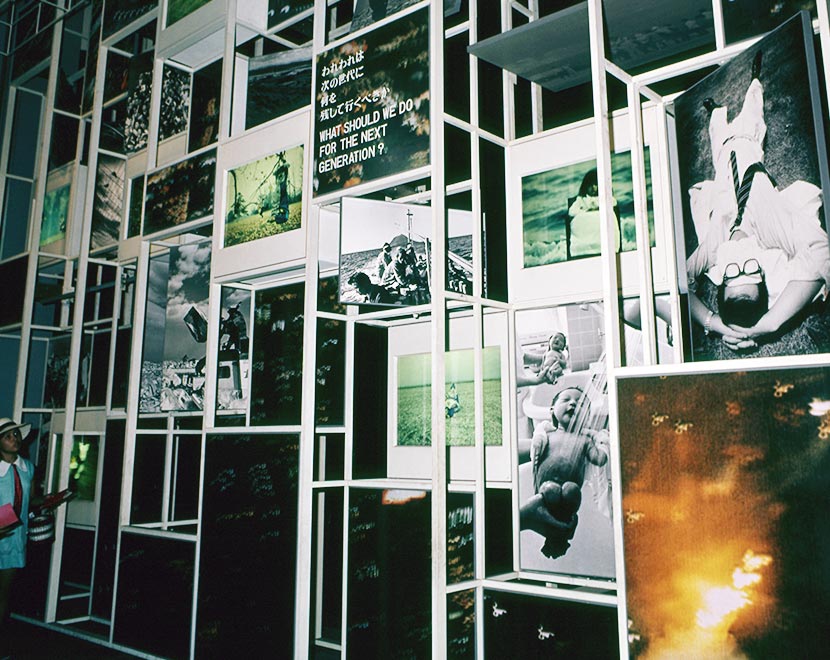 The Exhibition Building had a corridor layout, and visitors entered the movie hall after circling through the spaces delineated by walls. From the first through the fourth wall, the Exhibition Building was divided into four blocks expressing the basic concept of "spaces with more bountiful and cleaner air, water, and greenery."