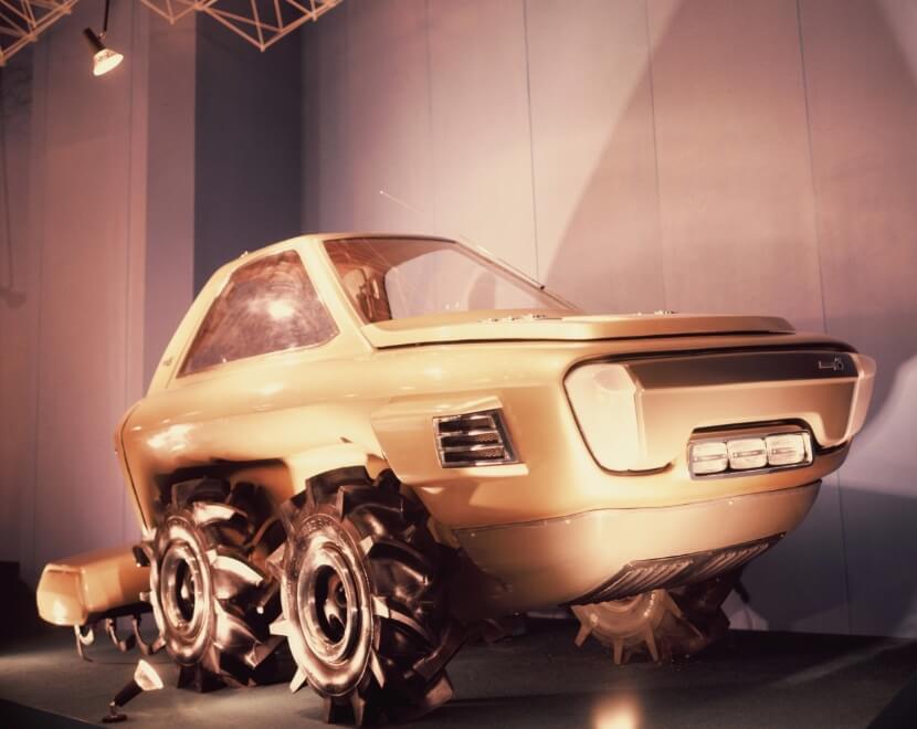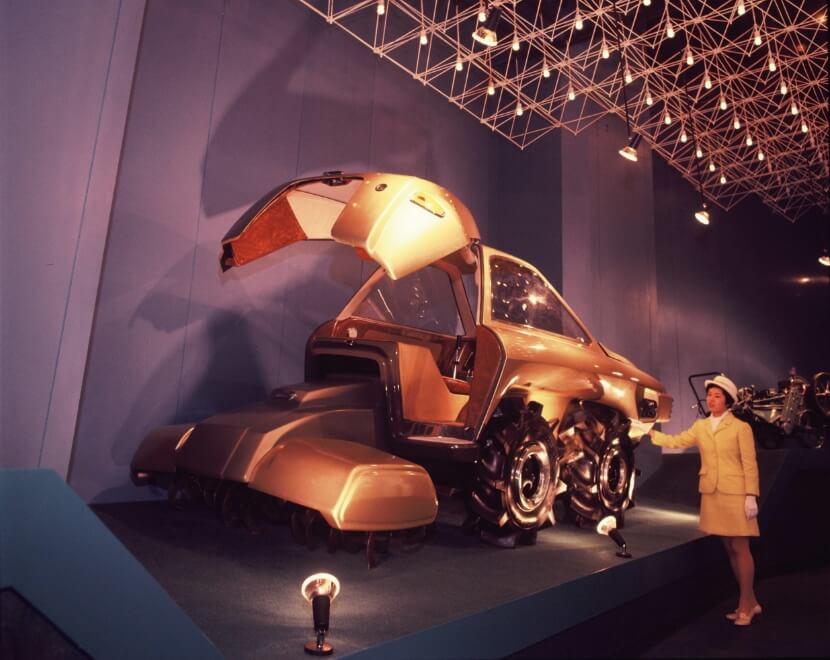 Across from the exhibition wall, the Dream Tractor developed by Kubota Tekko K.K.(now Kubota Corporation) was on display. Its sports car-like design expressed the contribution of advances in science and technology to the future of agriculture. As well as in that space along the third wall, it was also displayed in the outdoor rest area.