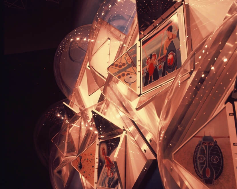 Here, black and white rotating panels and colored translucent sections were used. The front and back sides of the panels were independent of each other. The transitioning scenes expressed "profiles of the contradictions and confusion of modern society" and "human forms that retain their humanity even in the midst of such contradictions and confusion."