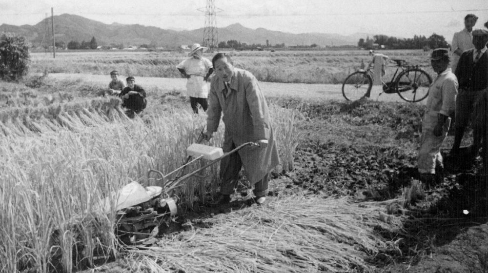 Testing of the HA1 Type Reaper-Binder. It took Kubota 10 years to develop the machine.