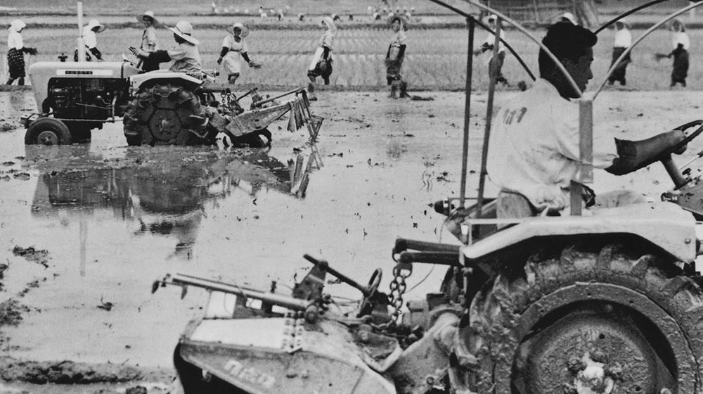 A decline in the rural workforce became a social issue during the record period of postwar economic growth. To meet farmer needs for labor-saving, efficient agricultural work, and thereby contribute to the mechanization of agriculture, equipment Kubota developed included not only tractors but also reaper-binders (machines that reaping and binding rice and wheat stems into bundles) and rice transplanters.