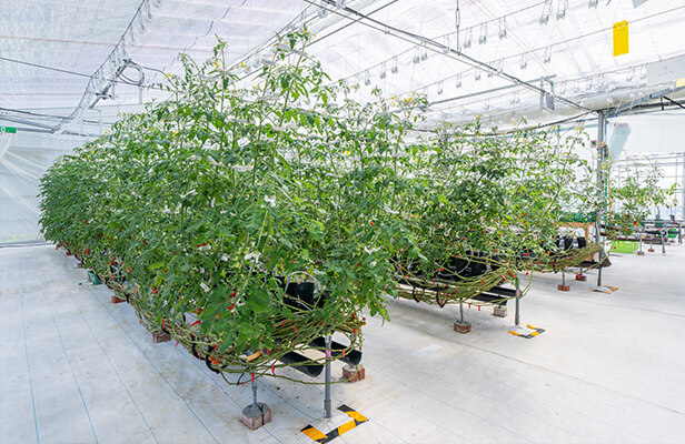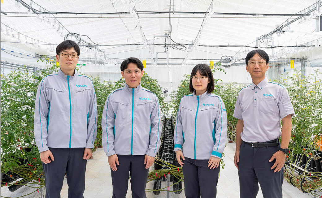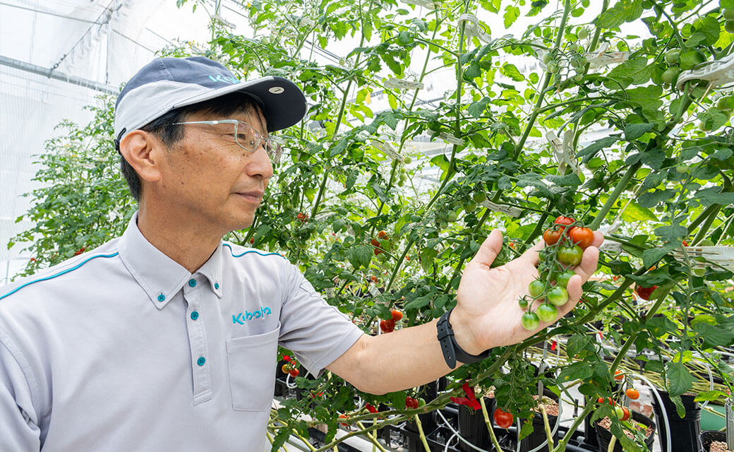 Kubota has turned its focus to high-sugar tomatoes, which have sugar content of 8 degrees Brix or greater. High-sugar tomatoes are a prime example of high-value-added crops for their strong profit potential. However, cultivating them requires advanced controls for both water and temperature. Because watering impacts the tomato’s sugar content, it must be especially precise and demands a greater level of experience and effort than conventional tomato farming.