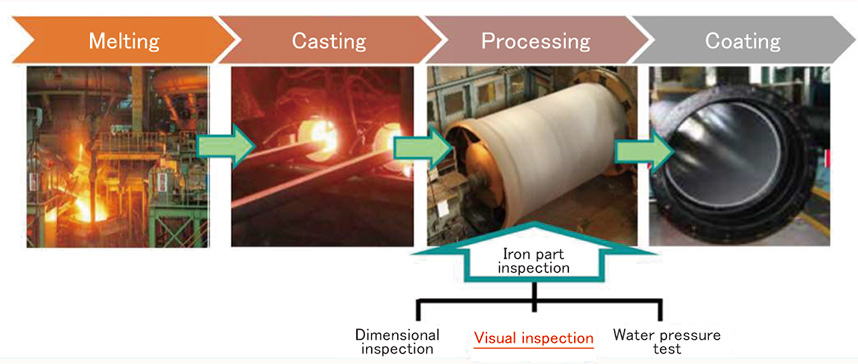 Because of visual sensory inspection for ductile iron pipe, we have the risks of inspection judgement variation by the inspectors and the overlooking of defects. To solve these problems, we have developed automatic inspection technology using image analysis by AI. With this technological development, we have achieved reliability improvements in inspection and labor saving for inspectors. In addition to the production line of iron pipe, we are going to promote technology expansion to the production line of synthetic pipe.