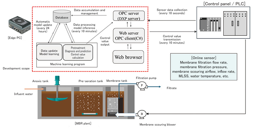 Membrane Bio-Reactor (MBR) is a wastewater treatment process which features superior effluent quality and a small footprint. Although it is a technology used for wastewater reuse due to its high solid-liquid separation performance, the reduction of energy and costs related to membrane scouring power is a challenge needing further discussion. In addition to hardware improvements, such as high integration of membrane modules and units, Kubota has developed a membrane scouring airflow control. This paper introduces our approach to membrane scouring airflow control using an automatically updated machine learning model that diagnoses membrane conditions. This developed system uses edge AI and can be easily introduced into existing systems, achieving more than 20% reduction in membrane scouring airflow compared to conventional models, with stable operating performance.